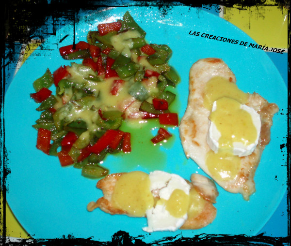 Se hace la pechuga a la plancha, mientras se saltean los pimientos en la sartén con una pizca de aceite. Se pone todo en el plato y las rodajas de queso encima de la pechuga, se echa unas cucharadas de curry caliente por encima.