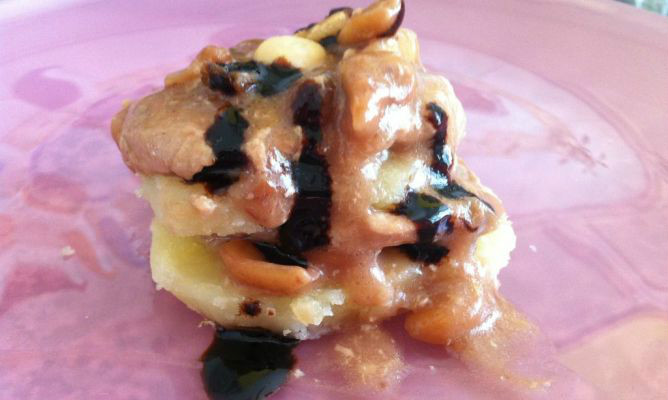 Se sirve intercalando las rodajas de patatas y los filetes. Salsea por encima.