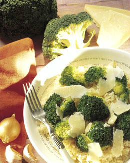 Con ayuda de un cuchillo cortar rizos de parmesano. Pasar el arroz a una fuente y colocar encima el brécol y el parmesano. Servir muy caliente.